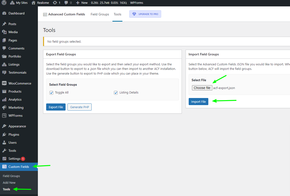 acf-export.jsonfromwp-content/themes/realome/demo/or you can download acf-export.json here. - When you click the Import button, ACF will import the field groups.