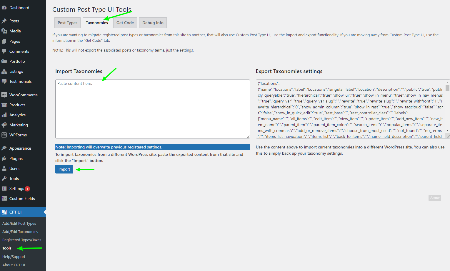 Importbutton, CPT UI will import the Post Types.