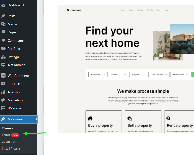 To get to the new Navigation Block, go to Appearance > Editor. From here, you can hover your mouse over the navigation menu area and click to select and edit navigation.