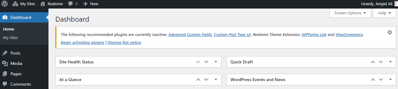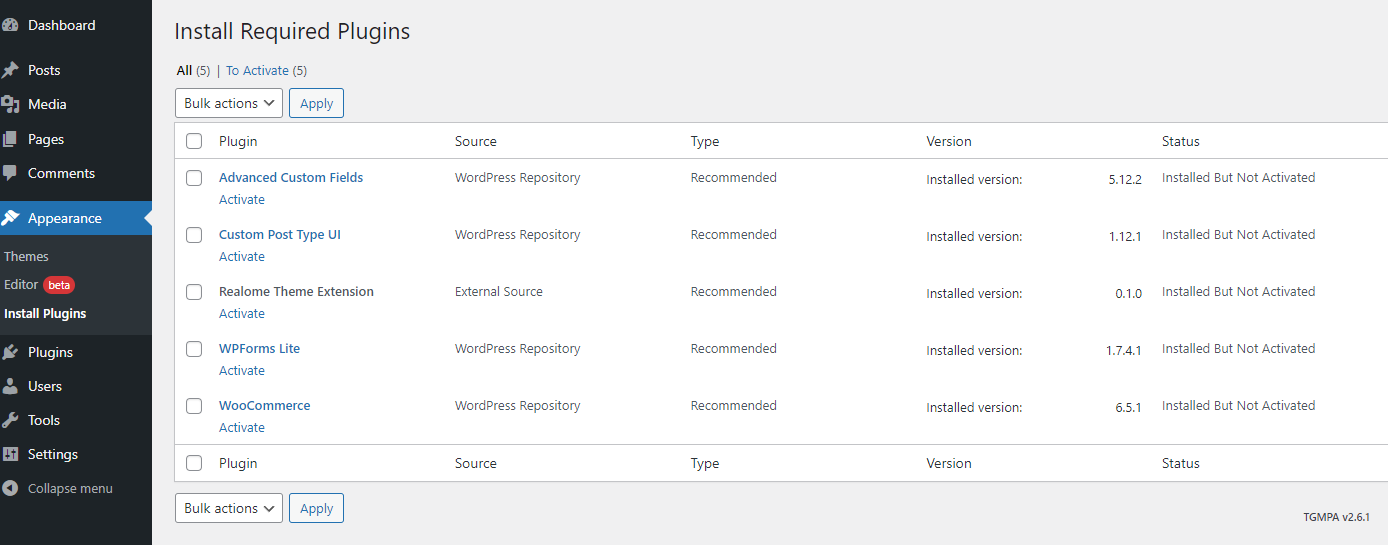 When you first activate the theme, you will be notified of what plugins are recommended to use with Realome. You don't have to install each one if you're not planning on using a particular feature. Once clicked, you will be taken to the Plugin Installation admin view, where you may install and activate each plugin, as depicted in the second screenshot below.